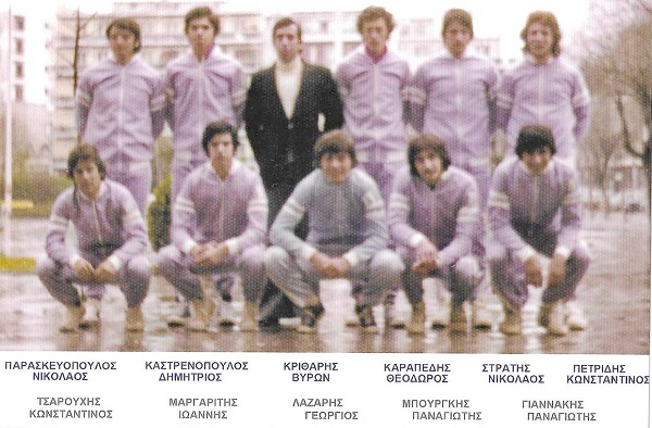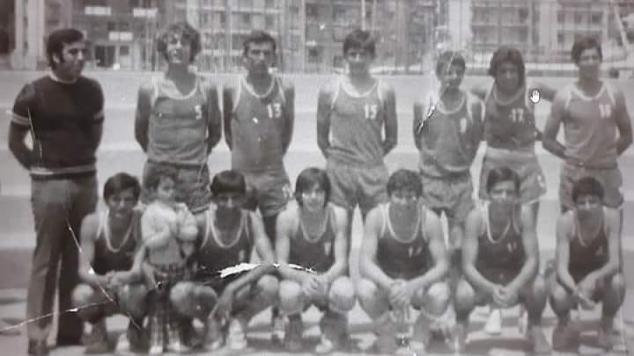 Ο προπονητής της ομάδας εφήβων του 1977 και μπασκετικός "πατέρας" του Παναγιώτη Γιαννάκη Βύρωνας Κρίθαρης με φόντο την ομάδα του 1977