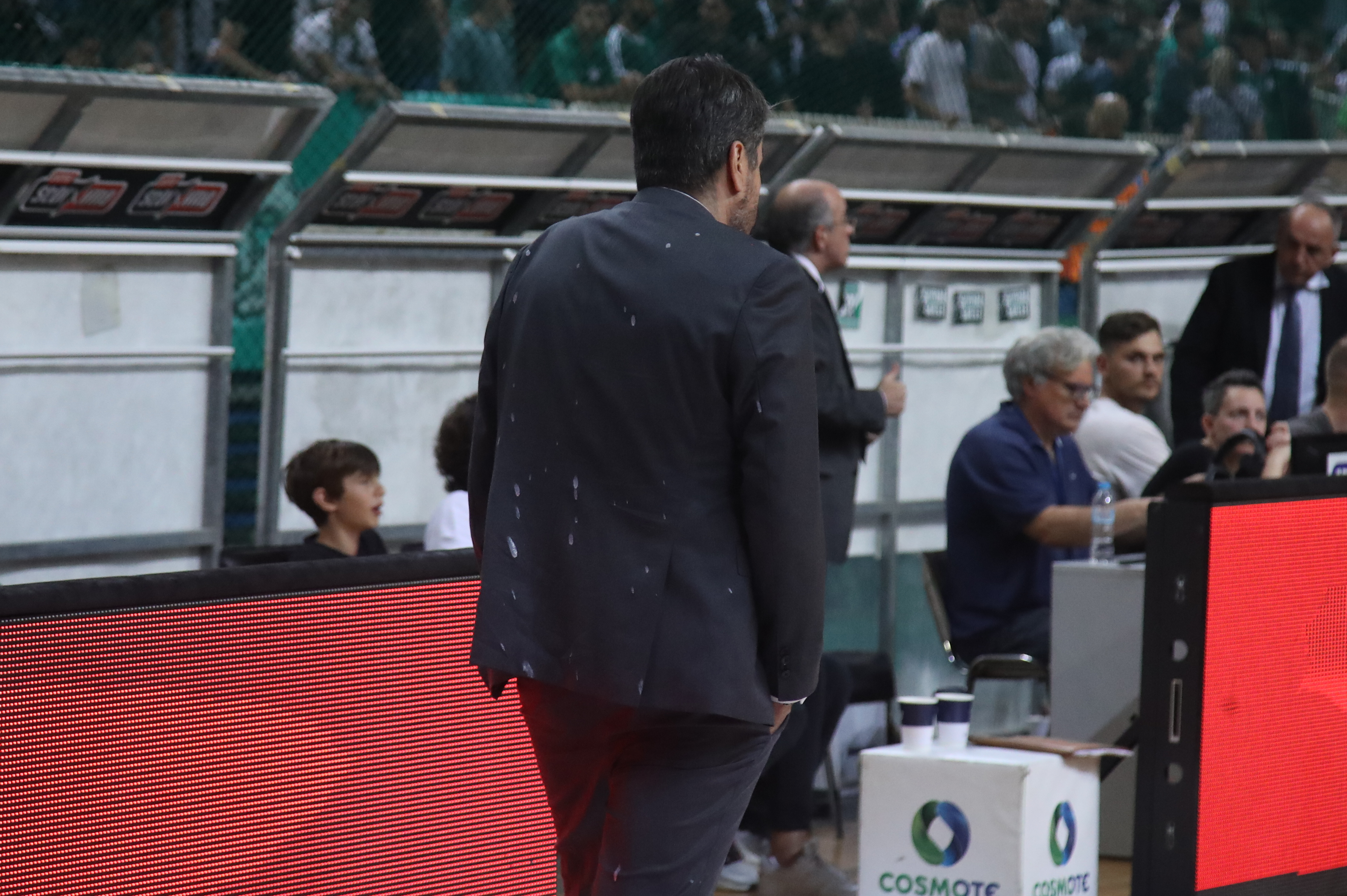 Γιαούρτια και νερά εκτοξεύτηκαν από τις κερκίδες του ΟΑΚΑ προς την αποστολή του Ολυμπιακού, ενώ ο Γιώργος Μπαρτζώκας δέχθηκε φραστική επίθεση από οπαδό, που τον ακολούθησε στον αγωνιστικό χώρο.