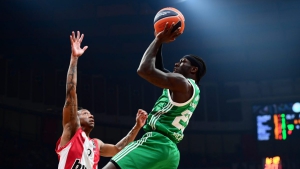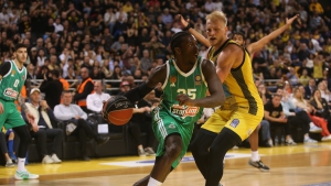 Άστοχες στις πρώτες τους επιθέσεις ήταν και οι δυο ομάδες, με τον Χουάντσο να «ανοίγει» το σκορ, πετυχαίνοντας τέσσερις προσωπικούς πόντους (4-0). Ο Οσμάν έκανε το 6-0, με τον Βεζένκοβ να βάζει τους πρώτους πόντους για τον Ολυμπιακό, τέσσερα λεπτά μετά την έναρξη της αναμέτρησης (6-2). Στη συνέχεια οι «πράσινοι» δεν ήταν μπορούσαν να σκοράρουν, με την ομάδα του Γιώργου Μπαρτζώκα να παίρνει το προβάδισμα (8-11). Ενάμιση λεπτό πριν τη λήξη του δεκαλέπτου το «τριφύλλι» έκανε ένα 4-0, με τον Φουρνιέ να έδωσε απάντηση από την περιφέρεια (12-14). Και δυο ομάδες ήταν αρκετά κοντά στο σκορ, βρίσκοντας λύσεις από μακριά, όμως, ο Ολυμπιακός κατάφερε να ολοκληρώσει το δεκάλεπτο μπροστά, με τον Γκος να πετυχαίνει γκολ-φάουλ και τον Λαρεντζάκη να ευστοχεί σε buzzer-beater, διαμορφώνοντας το 16-21.