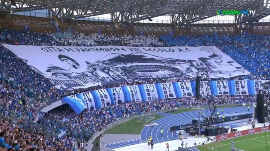 Έφτασε η ώρα της στέψης της Νάπολι στο ματς με τη Σαμπντόρια και οι οπαδοί της ύψωσαν κορεό με το γήπεδο της ομάδας, τον Ντιέγκο Αρμάντο Μαραντόνα και τον Bεζούβιο, ενώ κρέμασαν από κάτω τα τρόπαια τους.