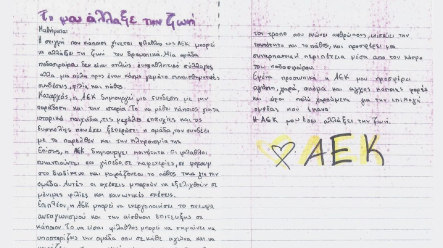 «Τι μου άλλαξε τη ζωή;» Το συγκεκριμένο θέμα έδωσε... έμπνευση στη 13χρονη Σωτηρία, μαθήτρια της Β' Γυμνασίου, απαντώντας πως «η ΑΕΚ!»