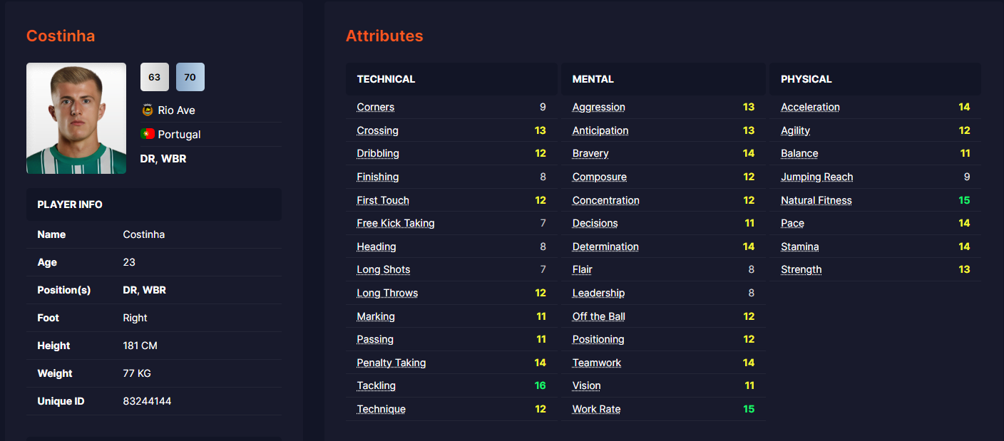 Ρίχνοντας μια ματιά στην καρτέλα του Κοστίνια, στο FM24, θα παρατηρήσουμε πως είναι ένα ισορροπημένος ποδοσφαιριστής, αφού 28 από τα 36 στατιστικά του Πορτογάλου έχουν βαθμό μεγαλύτερο του «10»!