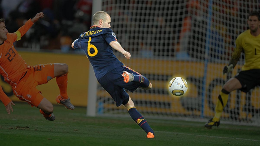 Πολλές οι φωτογραφίες της που μπορεί να απομονωθούν ως κύρια στιγμή του «φιλμ». Αυτή η μία πολύ, όμως είναι πολύ χαρακτηριστική και κινησιολογικά. Στην αντίστροφη μέτρηση της εξέλιξής της στα μάτια μας: ο Αντρές Ινιέστα στοπάρει την μπάλα, και τη στιγμή που εξαπολύει το κορυφαίο σουτ της ζωής του, αναμφίβολα θα είναι γεμάτη στο χρονικό ενδιάμεσο των δευτερολέπτων της από εκατομμύρια προσευχές, λαχτάρες και αγωνίες Ισπανών για ένα ξέσπασμα πανηγυρισμών, το οποίο τελικά έγινε πραγματικότητα και αποτέλεσε προοϊκονομία όσων ακολούθησαν στο γήπεδο και πίσω στην πατρίδα. Θα μπορούσε όλα να ήταν διαφορετικά, αν εκείνη η πάσα του Σεσκ στο 115', γινόταν στο 94' στον Βίγια που απλώς θα πλάσαρε - ήταν γραφτό να συμβεί έτσι, ώστε η στιγμή να μην είναι μόνο η κατάλληλη, μα και λυτρωτική. Μαζί με όλους και από ψηλά ο Ντάνι Χάρκε, ιδιαίτερος παραλήπτης σε μια σκηνή αφιέρωσης ξεχωριστή.