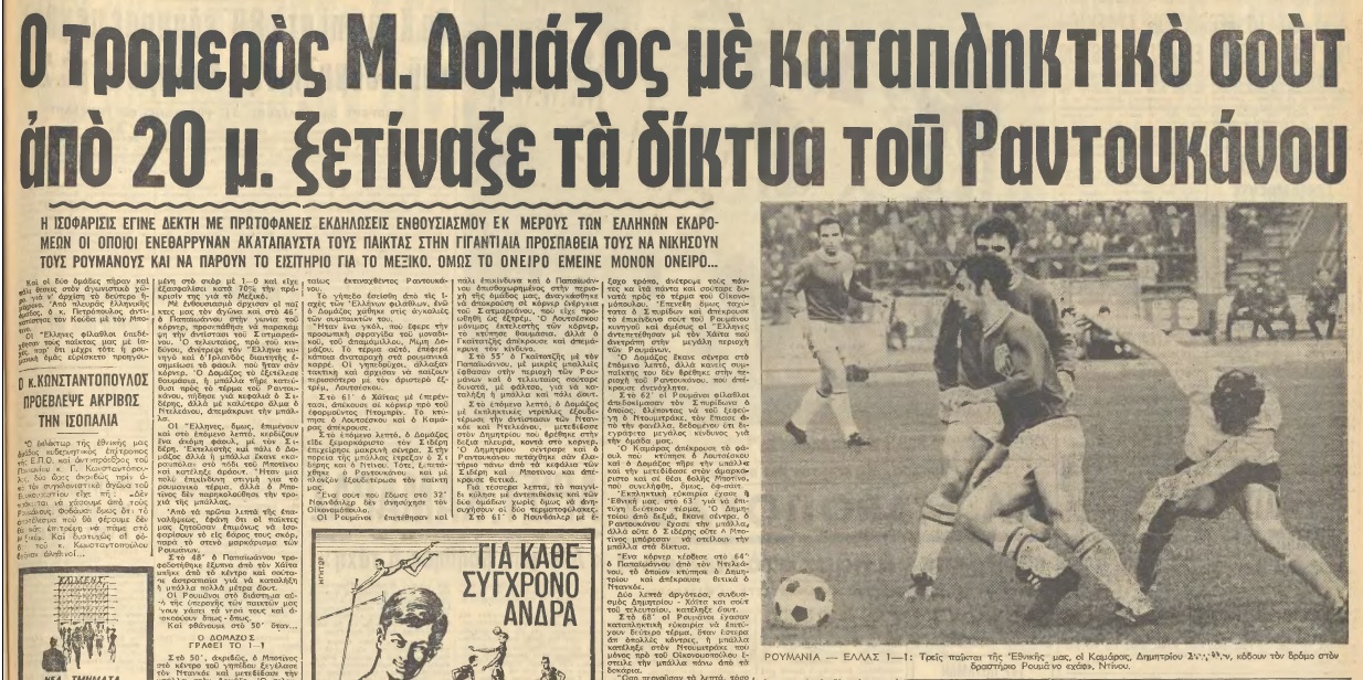 Ένα απόγευμα πριν 52 χρόνια στις 16 Νοεμβρίου του 1969, το ελληνικό ποδόσφαιρο έδινε στο Βουκουρέστι την πιο μεγάλη μάχη της ιστορίας του, με έπαθλο την πρόκριση στην τελική φάση του Παγκοσμίου Κυπέλλου που θα γινόταν στο Μεξικό το 1970. Έμελλε η μεγάλη φουρνιά του Δομάζου, του Σιδέρη, του Κούδα, του Μίμη Παπαϊωάννου, του Καμάρα του Ελευθεράκη και του Χάιτα να έμενε με το παράπονο!