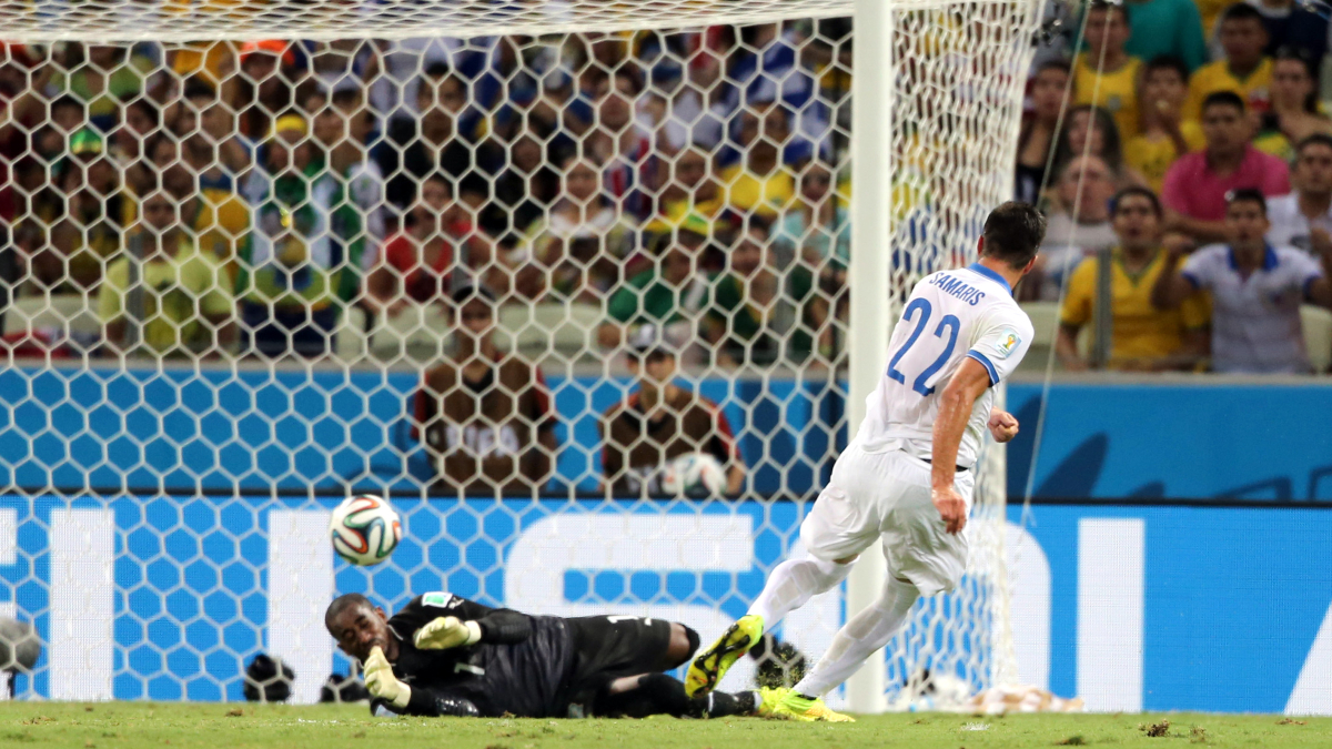 Το ρολόι έδειχνε 51 λεπτά μετά τα μεσάνυχτα. Ο Χολέμπας κάνει ένα γέμισμα στα «τυφλά» μέσα στην περιοχή, με τον Σαμαρά να κινείται προς την μπάλα, προτού ο Σίο με ένα ανεπαίσθητο άγγιγμα ρίξει στο έδαφος τον Έλληνα φορ. Ο Κάρλος Βέρα με ένα νεύμα έδειξε το σημείο του πέναλτι και έδωσε στην Ελλάδα το «φιλί της ζωής».