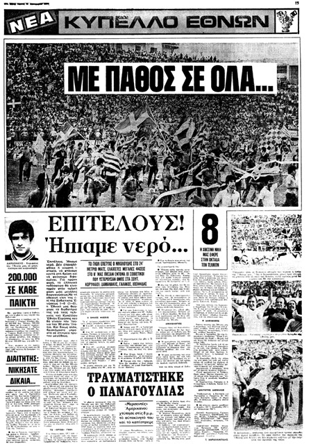 Η Εθνική μας έχασε κι άλλες ευκαιρίες να σκοράρει, ενώ ο Αρδίζογλου είδε το δοκάρι να του στερεί το 2-0, όπως συνέβη αντίστοιχα και με τους αντιπάλους μας. Όλα τα αρχικά προγνωστικά για τον Όμιλο της Ελλάδας ανατράπηκαν! Η λήξη του αγώνα βρήκε τους ποδοσφαιριστές και τον Αλκέτα Παναγούλια να γίνονται ήρωες και... «ένα» με τον κόσμο που μπήκε στο χορτάρι για να πανηγυρίσει την τεράστια νίκη, που τελικά μετατράπηκε σε πρόκριση μετά και την ήττα της Φινλανδίας με 3-1 από τους Ούγγρους!