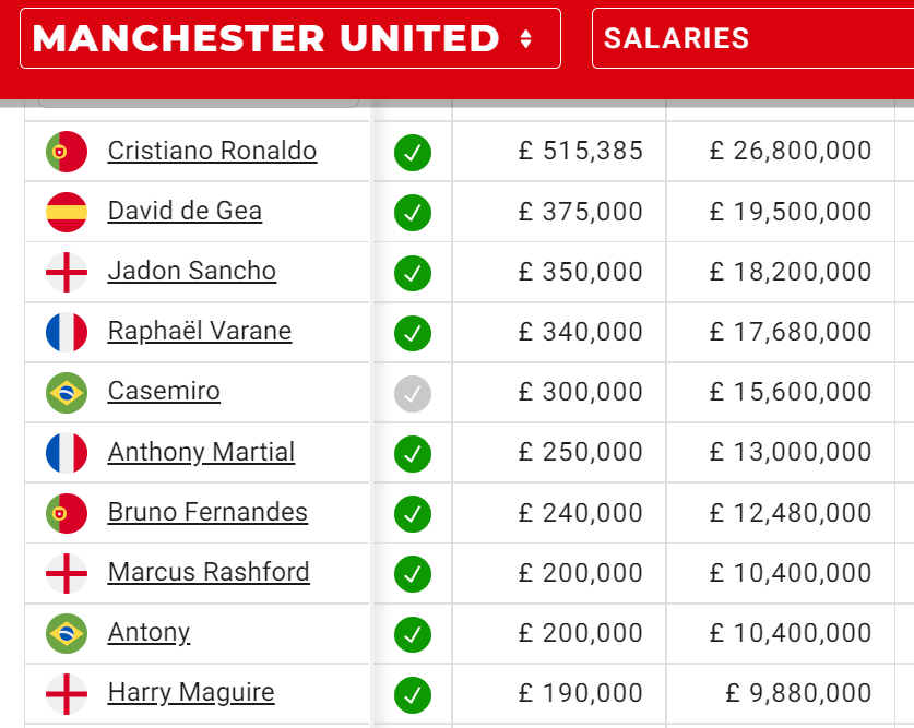 Φυσικά ο πιο ακριβοπληρωμένος παίκτης της Γιουνάιτεντ είναι ο Κριστιάνο Ρονάλντο, με τις εβδομαδιαίες του αποδοχές να φτάνουν τις 515 χιλιάδες λίρες, ωστόσο δεν έπαιξε ούτε λεπτό στο ντέρμπι. Απ’όσους αγωνίστηκαν για την Γιουνάιτεντ, ο Νταβίντ Ντε Χέα ήταν αυτός που αμείβεται περισσότερο, λαμβάνοντας 375 χιλιάδες λίρες ενώ από κοντά είναι και ο Τζέιντον Σάντσο με 350 χιλιάδες.