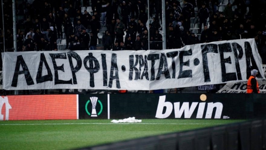 Θυμίζουμε ότι το συγκεκριμένο πανό αναρτήθηκε στο γήπεδο της Τούμπας, στη ρεβάνς του ΠΑΟΚ με τη Μίντιλαντ και αποτέλεσε κίνηση συμπαράστασης κάποιων φίλων του «Δικέφαλου του Βορρά» στους προφυλακισμένους δολοφόνους του Άλκη Καμπανού.