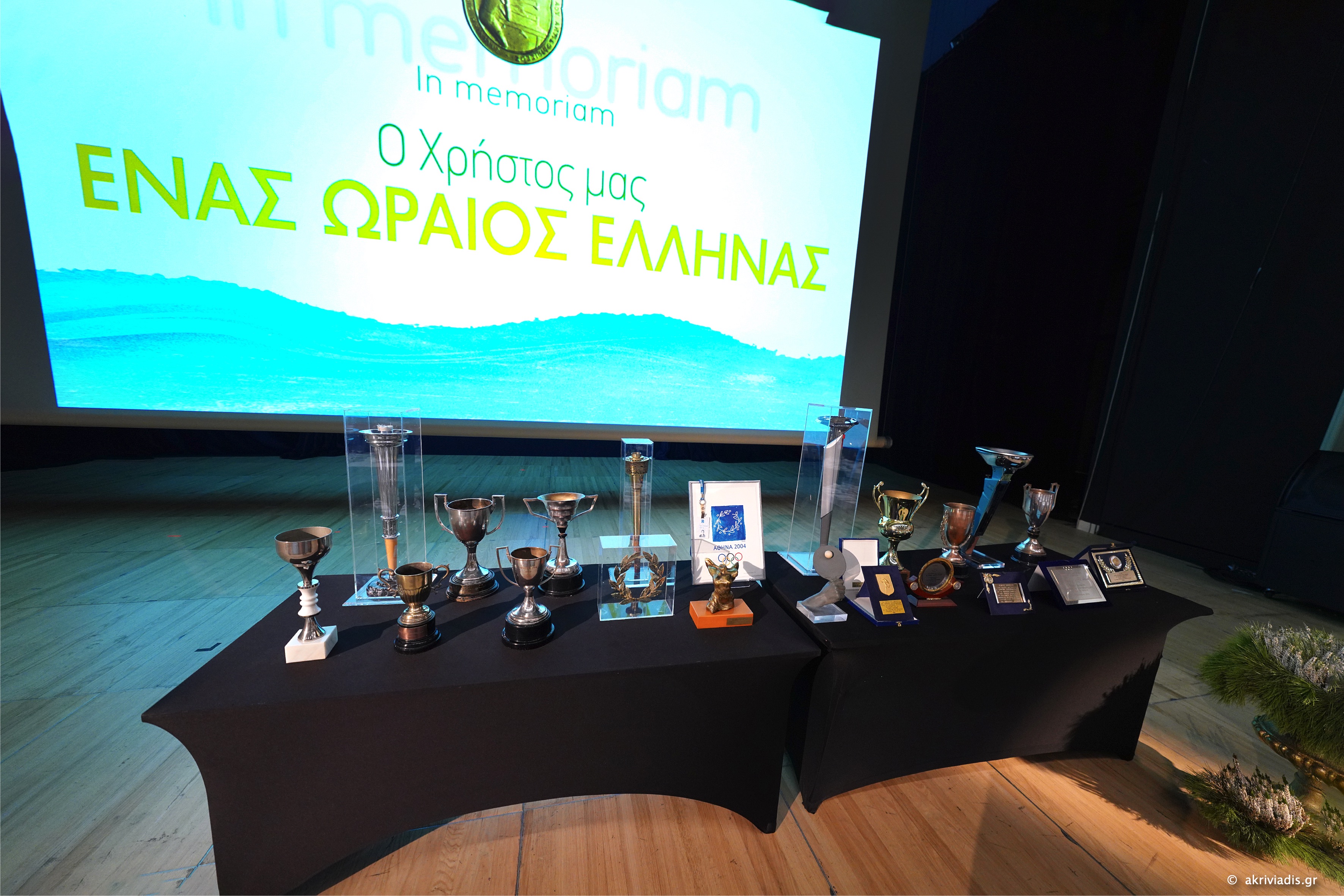Χρυσά μετάλλια, κύπελλα και ολυμπιακές δάδες από τις ελληνικές, βαλκανικές, μεσογειακές και διεθνείς συμμετοχές του σε πάνω από 650 αθλητικές διοργανώσεις κοσμούσαν τη σκηνή του Μεγάρου στην οποία προβλήθηκαν στιγμές από τη ζωή και την δράση του με κορυφαίο το σπάνιο βίντεο από τη στιγμή της απονομής του χρυσού κυπέλλου για τη νίκη του με την Εθνική Ελλάδας με 5-0 εναντίον της Τουρκικής ομάδας το 1961, στη Σμύρνη.